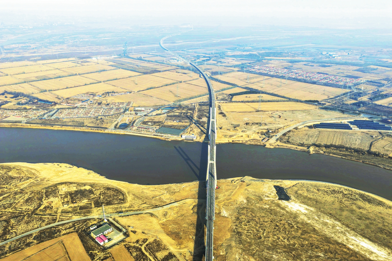 包银高铁起自包头站,经内蒙古自治区包头市、巴彦淖尔市、鄂尔多斯市、乌海市,宁夏回族自治区石嘴山市、银川市,接入银川站,正线全长519公里,设计时速250公里,实行分段建设,其中,惠农至银川段全长97公里,已于2024年10月开通运营,此次开通的包头至惠农段全长422公里。12月22日拍摄的包银高铁乌海黄河特大桥(无人机照片)。