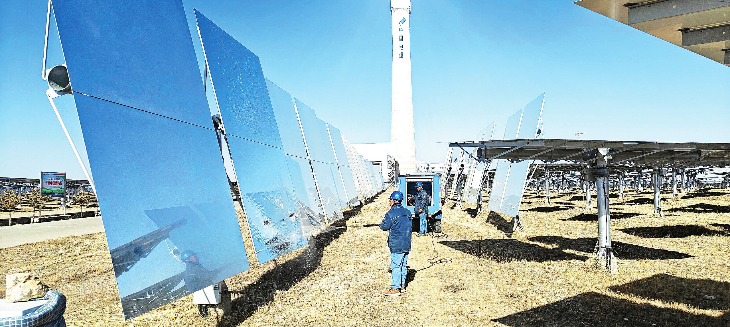 初冬的青海高原,寒风裹挟着沙粒掠过共和盆地。在这片广袤的土地上,一排排光热定日镜阵列如银色星河般熠熠生辉。