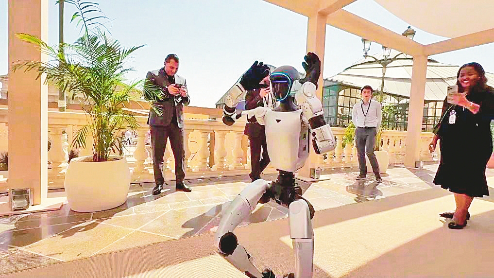 第九届沙特阿拉伯“未来投资倡议”大会27日在沙特首都利雅得开幕。来自杭州宇树科技的G1人形机器人“奔奔”在大会中惊艳登场。身高约132厘米、体重约35公斤的“奔奔”,身姿灵动,动作精准,展现出超强的灵活性与科技感。每当它登台展示技能,都会吸引大量参会者的关注。(来源:新华社)