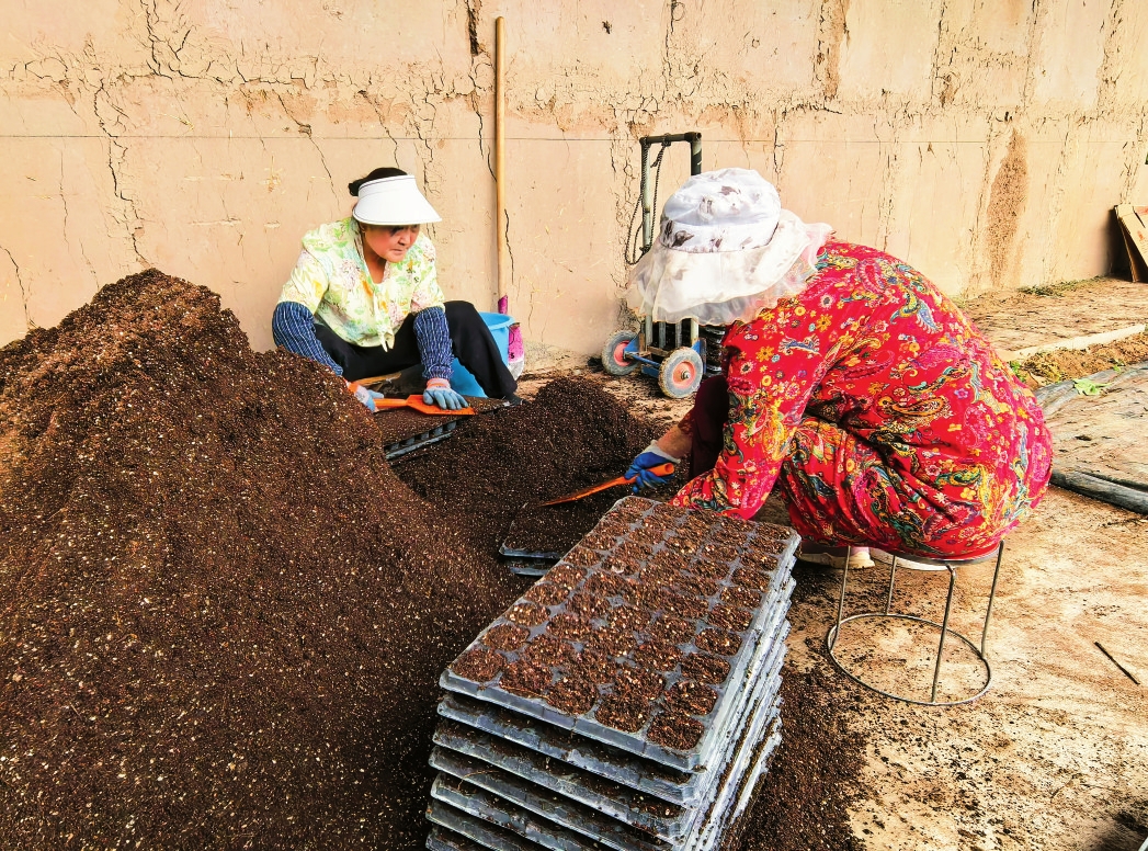 技术员蔺江明是甘肃武威人,有着多年的温室种植经验,被村委特聘为技术指导员。她蹲在苗床边,仔细查看幼苗的长势,说话带着浓重的西北口音,但讲起技术来条理分明: