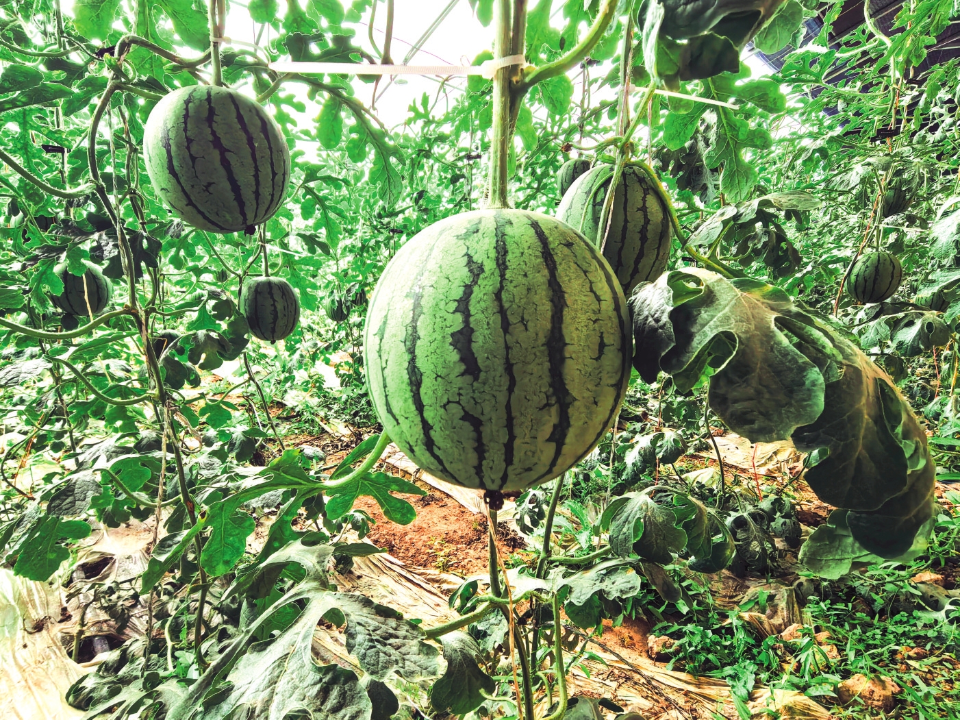 西瓜藤顺着吊绳攀援而上,圆滚滚的西瓜藏在叶片下,像一个个绿皮球。2000多斤西瓜已经率先打开销路,以每斤4.5元的价格销往甘肃。