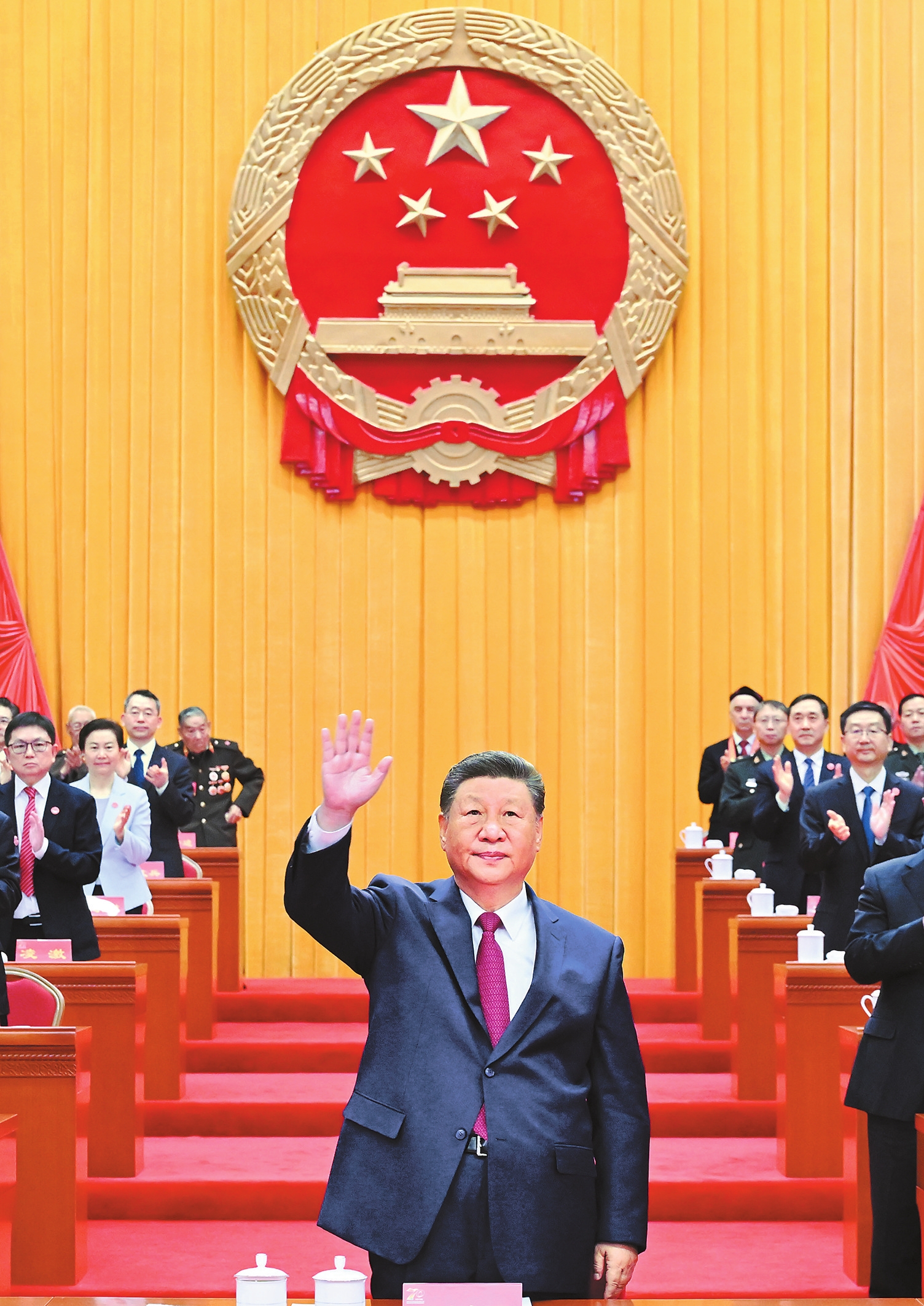 ཟླ9ཚེས25ཉིན་གྱི་སྔ་དྲོར། ཤིན་ཅང་ཡུ་གུར་རང་སྐྱོང་ལྗོངས་དབུ་བརྙེས་ནས་ལོ་ངོ70འཁོར་བའི་རྟེན་འབྲེལ་ཚོགས་ཆེན་ཤིན་ཅང་མི་དམངས་ཚོགས་ཁང་དུ་གཟབ་རྒྱས་ངང་འཚོགས་ཤིང་། ཀྲུང་གུང་ཀྲུང་དབྱང་གི་སྤྱི་ཁྱབ་ཧྲུའུ་ཅི་དང་། རྒྱལ་ཁབ་ཀྱི་ཀྲུའུ་ཞི། ཀྲུང་དབྱང་དམག་ཨུའི་ཀྲུའུ་ཞི་བཅས་ཡིན་པའི་ཞི་ཅིན་ཕིང་རྟེན་འབྲེལ་ཚོགས་ཆེན་ལ་ཞུགས་པ།