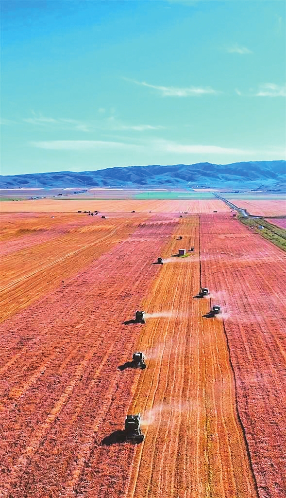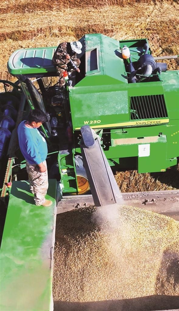 མཐའ་ཡས་པའི་ཀོས་ནན་རྫོང་གི་ཞིང་སའི་སྟེང་དུ་ད་ལོའི་སྟོན་དུས་ཀྱི་ལོ་ལེགས་བསྡུ་བའི་རྣམ་པས་ཡོངས་སུ་ཁེངས་ཤིང་།བརྔ་བསྡུ་འཕྲུལ་ཆས་ལས་ཐོན་པའི་ལོ་ལེགས་ཀྱི་འབྲུ་རྡོག་རེ་རེ་དགོས་འདོད་ཀྱི་ནོར་བུ་བཞིན་ཐང་མར་བརྡལ་དུས་ཡུལ་འདིའི་རོང་འབྲོག་མང་ཚོགས་ཀྱི་གདོང་ལ་དགའ་བའི་འཛུམ་དང་དགོད་པའི་ཉམས་ཀྱིས་ཕྱུག་ཡོད།ཁོད་ཡངས་པའི་གཤིན་ས་བཟང་བོར་འབྲུ་རིགས་སྣ་ལྔའི་འདེབས་འཛུགས་ཀྱི་ལས་ལ་བརྩོན་པའི་དབང་གིས་ད་ལྟ་ཁོ་ཚོར་འཛད་མེད་ཀྱི་ལོ་ལེགས་བྱུང་སྟེ།མཚོ་ངོས་ལས་སྨི3000ཡོད་པའི་མཐོ་སྒང་གི་གནས་མཆོག་འདིར་གསེར་མདོག་གི་སྙེ་མའི་རྦ་རླབས་འཕྱོ་ཞིང་མ་བྲིས་རང་བྱོན་གྱི་མཛེས་སྡུག་གི་རི་མོ་ཞིག་ང་ཚོའི་མཐོང་ལམ་དུ་མངོན་ཡོང་།